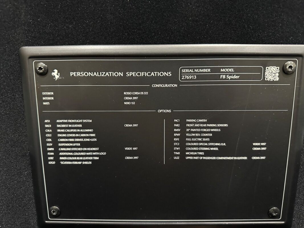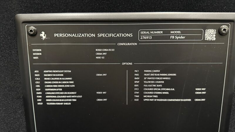 フェラーリF8スパイダー F1 DCT 左H 【オプション】・アダプティブフロントライトシステム・スクーデリアフェラ20インチ鍛造ホイール・スクーデリアフェラーリシールド・アルミニウムブレーキキャリパー・カーボンファイバー製エンジンカバー・サスペンションリフター・レザーバックレスト・カーボンファイバーステアリング・カラーステアリングホイール・ヘッドレスト跳馬刺繍・ロゴ入りカラーマット・インナーカラーリアレザートリム・パーキングカメラ・フロント、リアパーキングカメラ・20インチ鍛造ホイール・イエローレブカウンター・フル電動シート・カラースペシャルステッチ