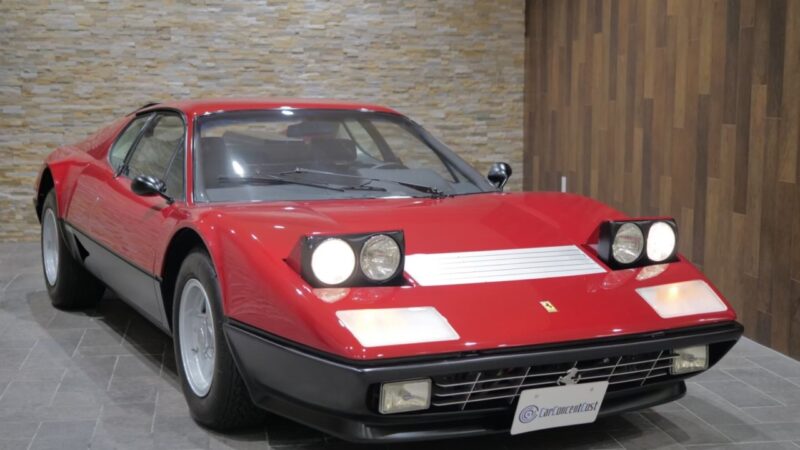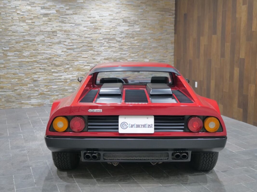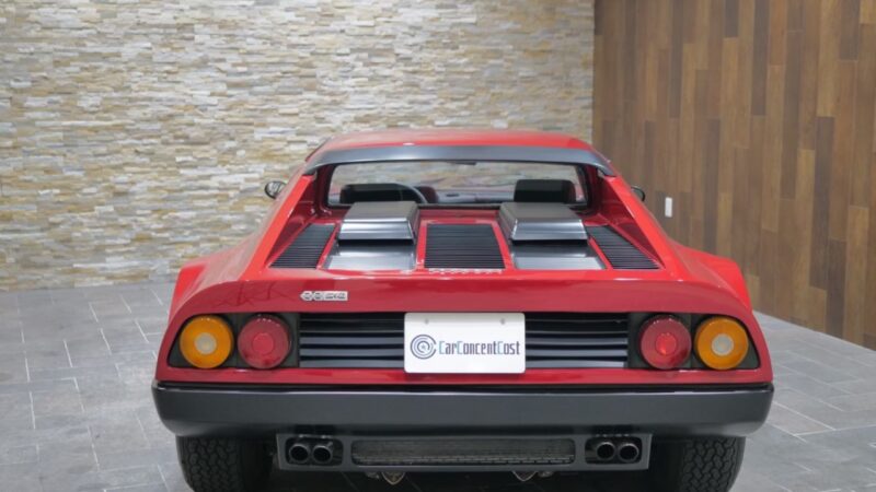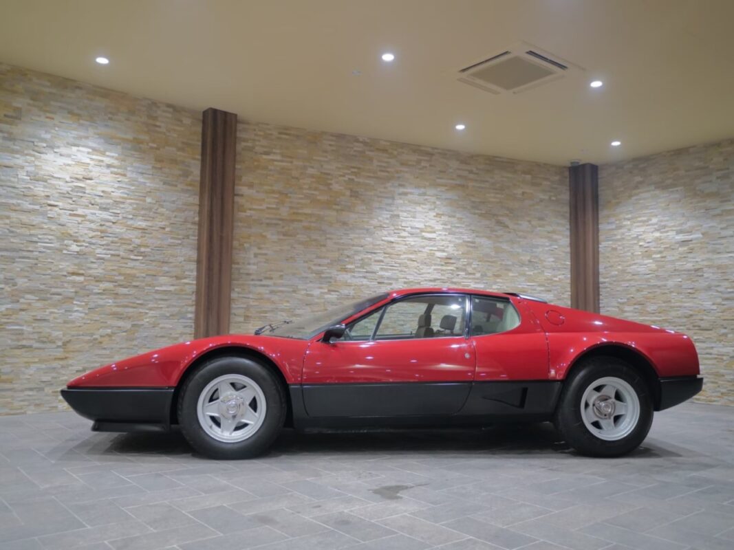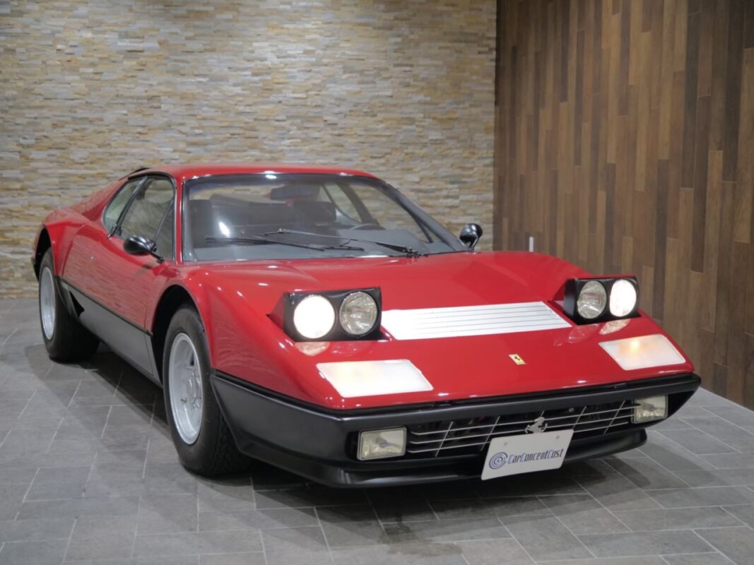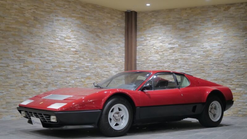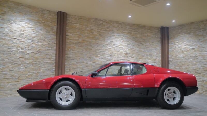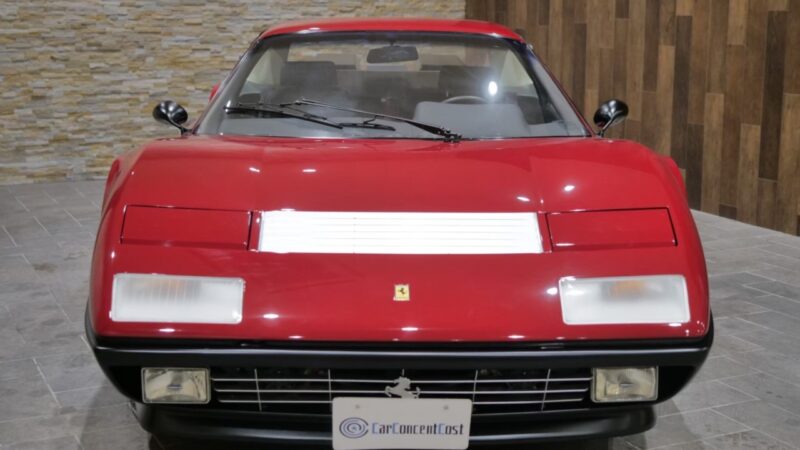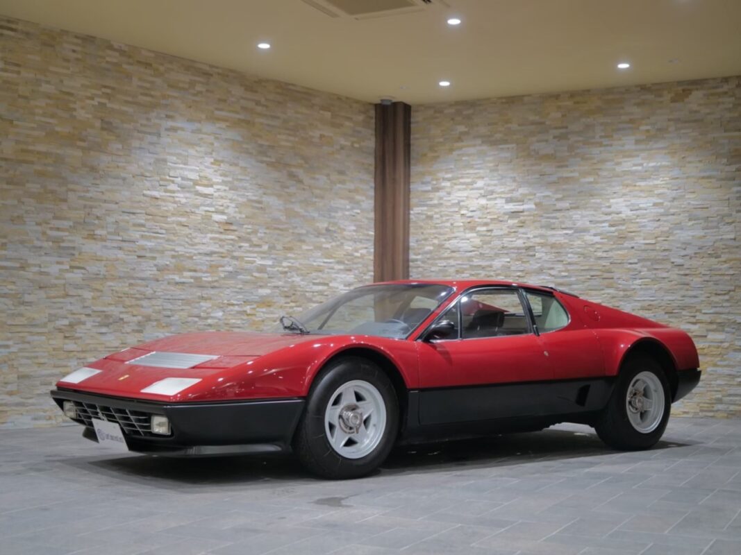 フェラーリ512BB 応談 イタリアで新車デリバリー後、1980年代初頭に米国へ輸出された初期キャブレターモデル。ロッソコルサにリペイント済みで、オリジナルのブラックレザー(デイトナシート)を保持した保存状態良好な個体です。 5.0Lフラット12エンジン+5速MTを搭載し、1995年にレストアおよび全塗装、2014年にタイミングベルト交換含むフルサービスを実施。 3オーナー履歴、オリジナルブック、ツールキット、スペアタイヤ付属。